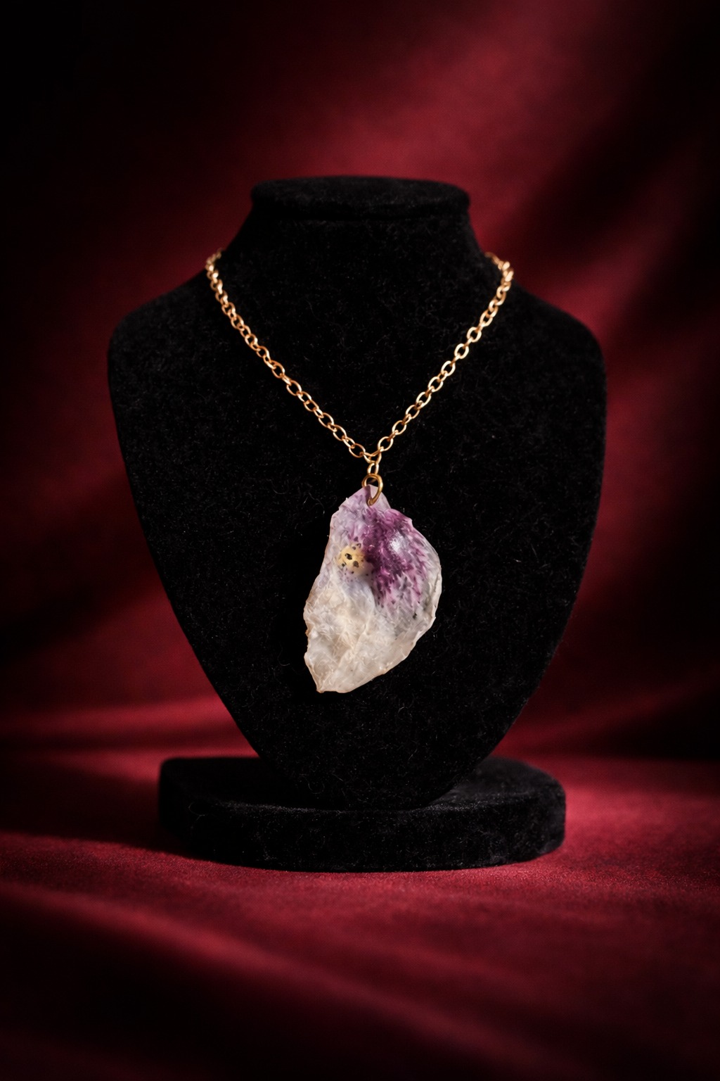 Collar artesanal elaborado con un pétalo de orquídea natural preservado, manteniendo su forma orgánica e irregular. Cada pieza es única en color y textura, montada en cadena dorada para un acabado elegante y natural.