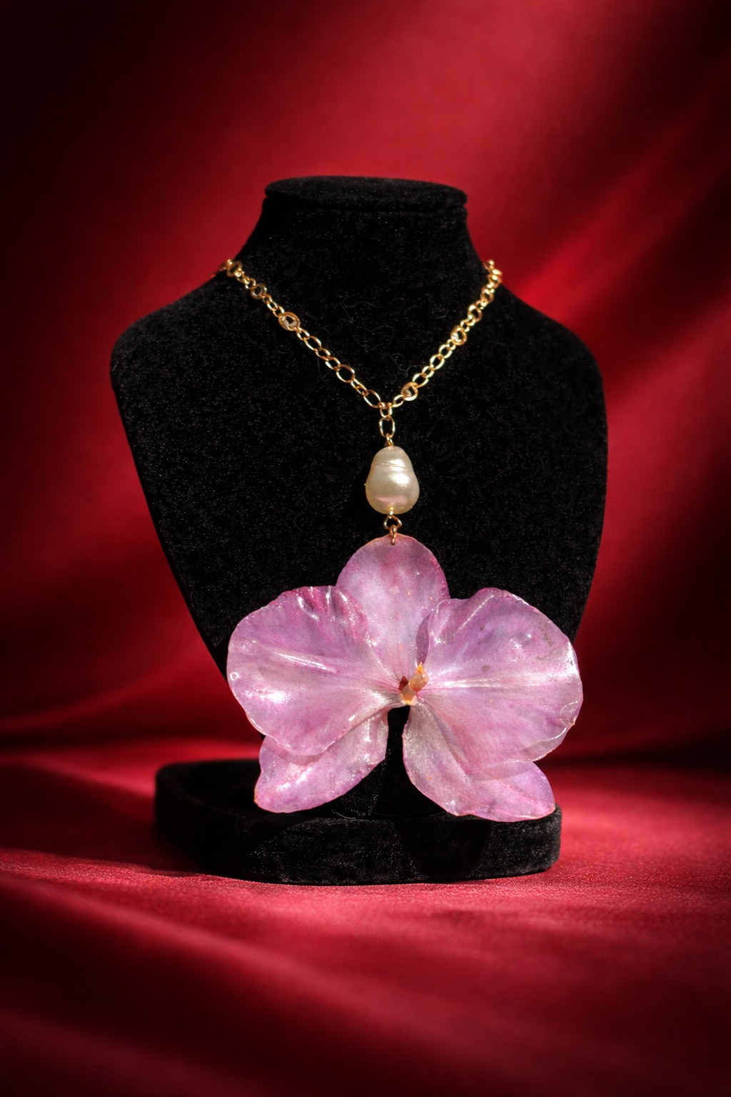 Collar elaborado a mano con orquídea natural preservada en tono lila, acompañada de detalles en perlas. Cada pieza es única.